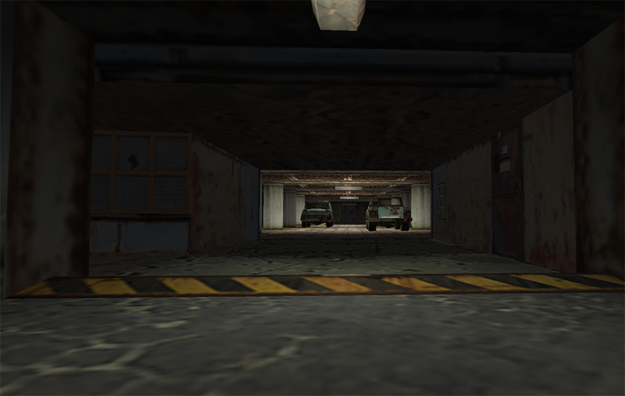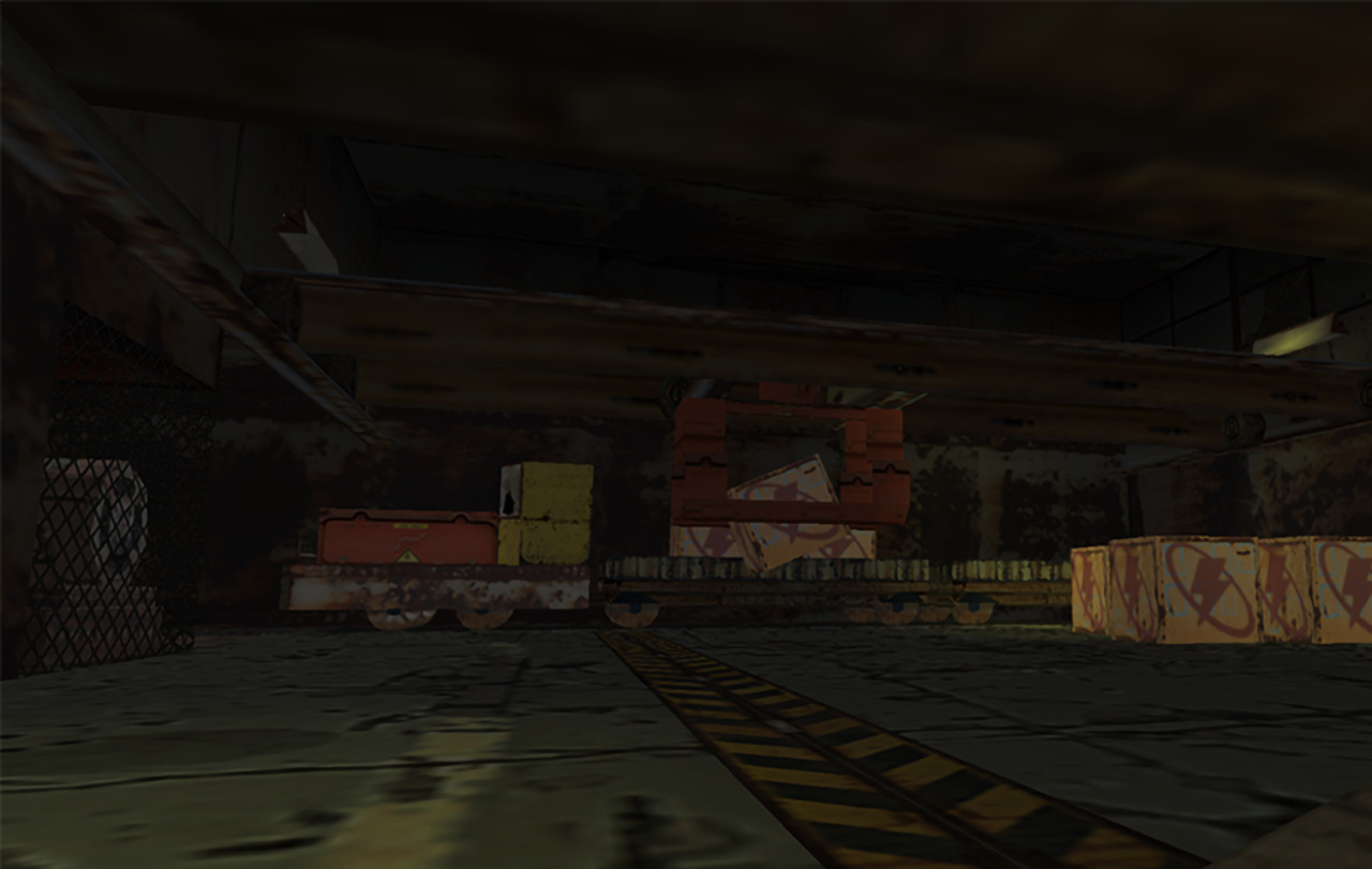 You start the race under a non-functional car elevator and drive throught the different track areas. Like an x-ray chamber, the giant parking lot, past the disused mine railways and the lost warehouses.